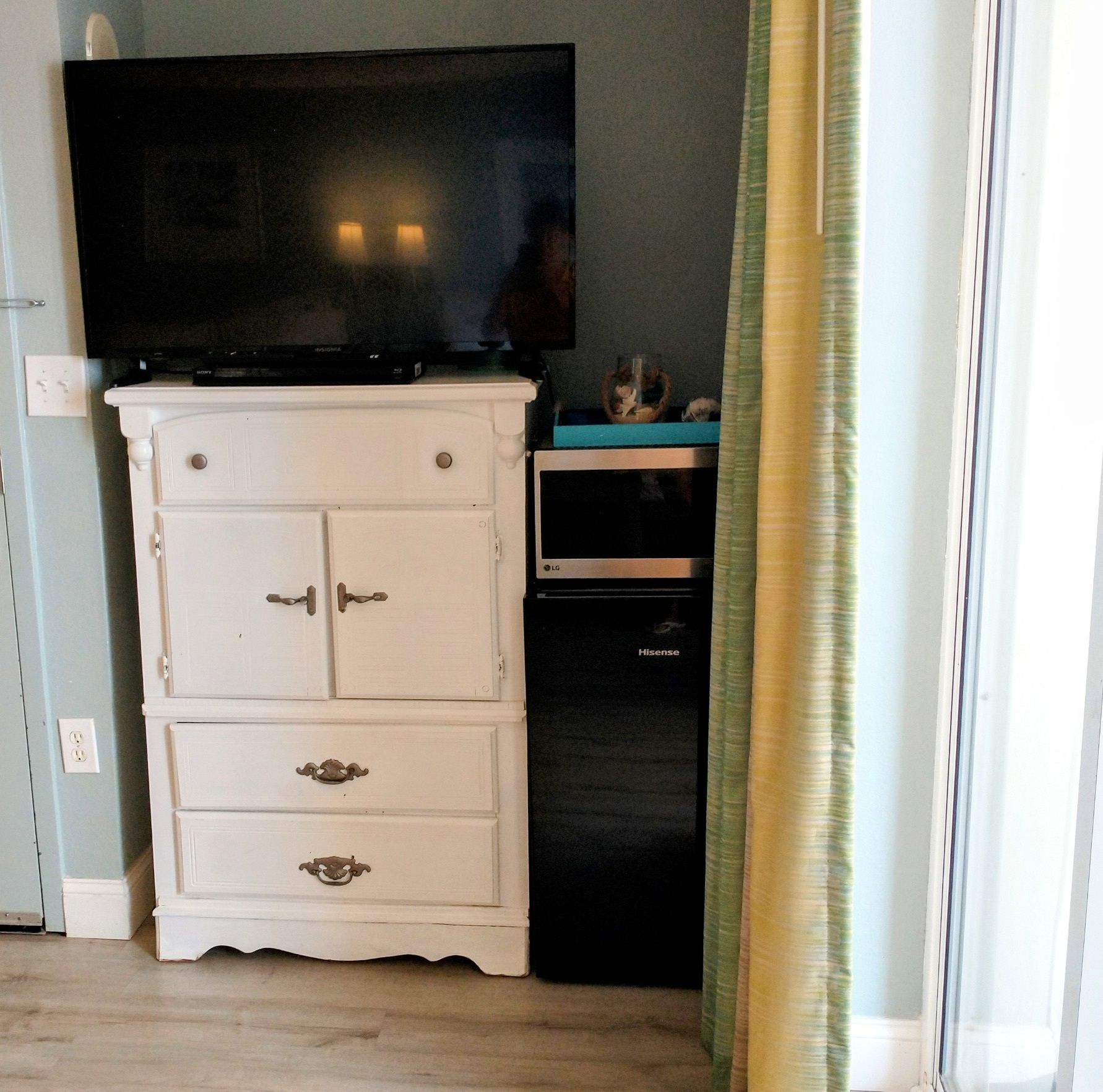 This one room condo is located in Tower 1 on the quiet sixth floor. The condo sleeps 4. It has two full queen beds complete with linens that are freshly made up for you. This Beach Condo has a new smart TV with cable, DVD Player, movies, free Wi-Fi and board games. The kitchenette has a microwave, beverage fridge, Keurig coffee maker, mini toaster oven, blender and eating utensils. Also included is a wall-mounted hair dryer, iron, sunscreen, boogie boards, beach chairs and pool noodles. It is so well stocked that you do not even need a toothbrush.